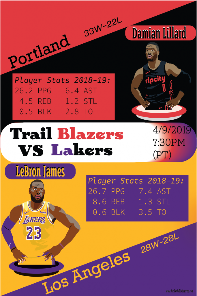 A graphic highlighting an upcoming matchup between the Portland Trailblazers and the Los Angeles Lakers